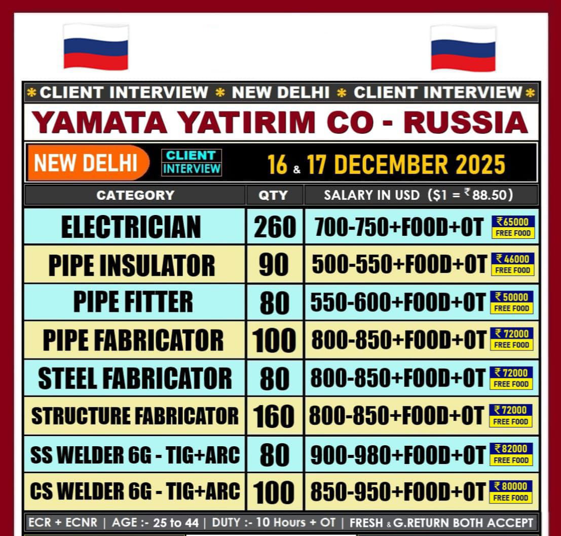 Walk‑in interviews for employment opportunities for Russia. 📅 Dates: 16th & 17th December 📍 Venue: Delhi, India